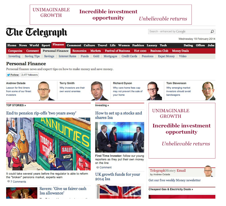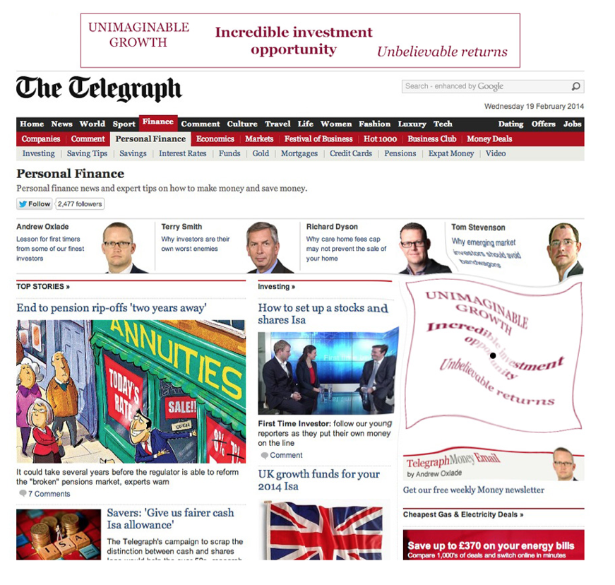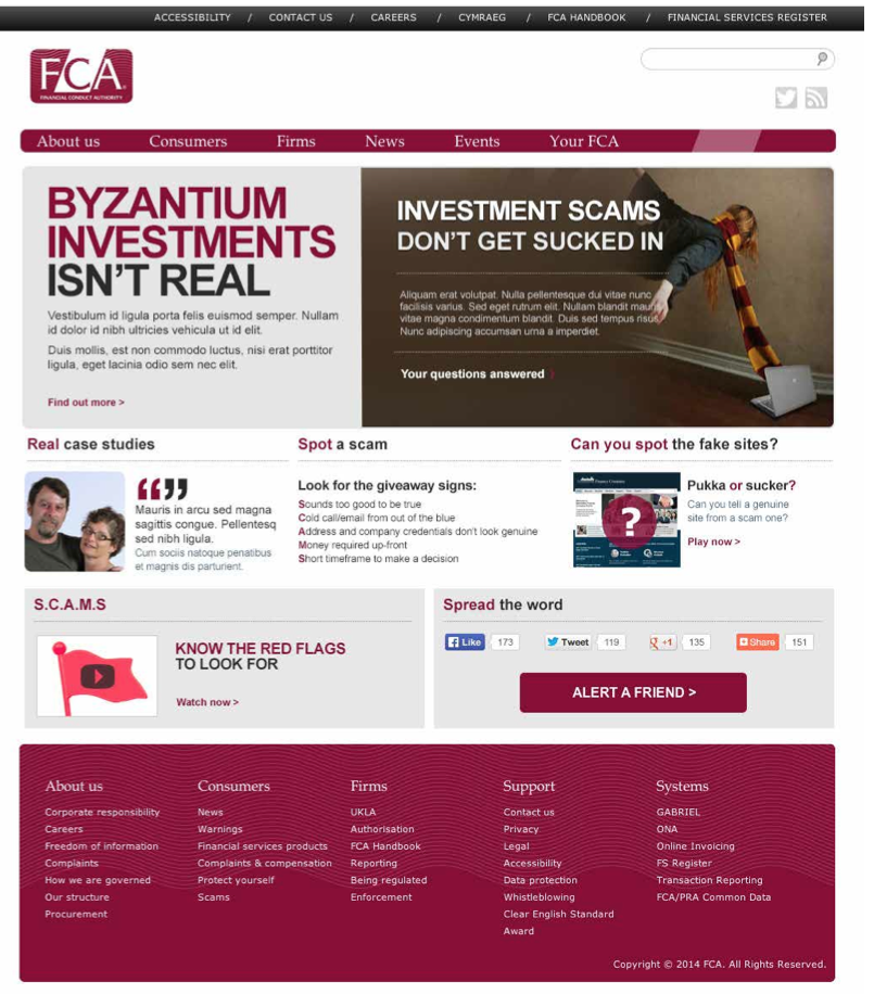 The FCA (Financial Conduct Authority) wanted to highlight how people can get sucked into investment scams. So we created a concept that used a fake website (and supporting banner ads) to get people’s interest in what seemed an opportunity too good to miss. It certainly was – when they clicked on the further information section on the site they we were redirected to the FCA site highlighting the dangers of being pulled into investment scams.